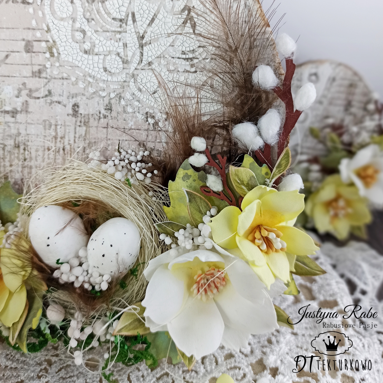 Wszystkie kwiaty wykonałam własnoręcznie z foamiranu. Oprócz nich możecie znaleźć bazie, które powstały z tekturkowych gałązek, słodkiego ażurowego zajączka, styropianowe jajeczka, sizal oraz kilka innych dodatków.